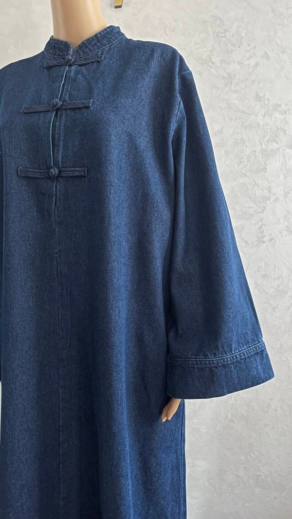 Robe longue en jean bleu foncé , d’une longueur de 145cm. Elle est dotée de manches droites, de poches pratiques et d’une fermeture discrète au niveau de la poitrine